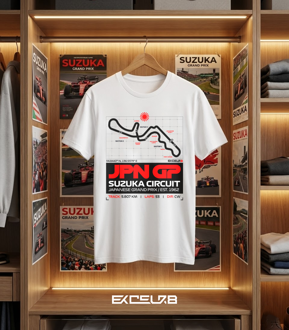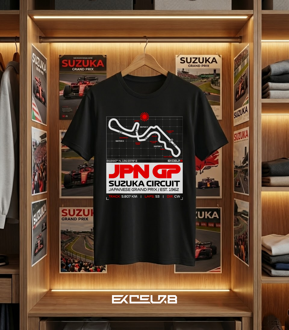 Designed for the true enthusiast, the graphic balances a retro “Rising Sun” aesthetic with modern grid-map aesthetics. Whether you’re watching from the stands or the streets, this piece brings the spirit of the Japanese Grand Prix to your daily rotation.