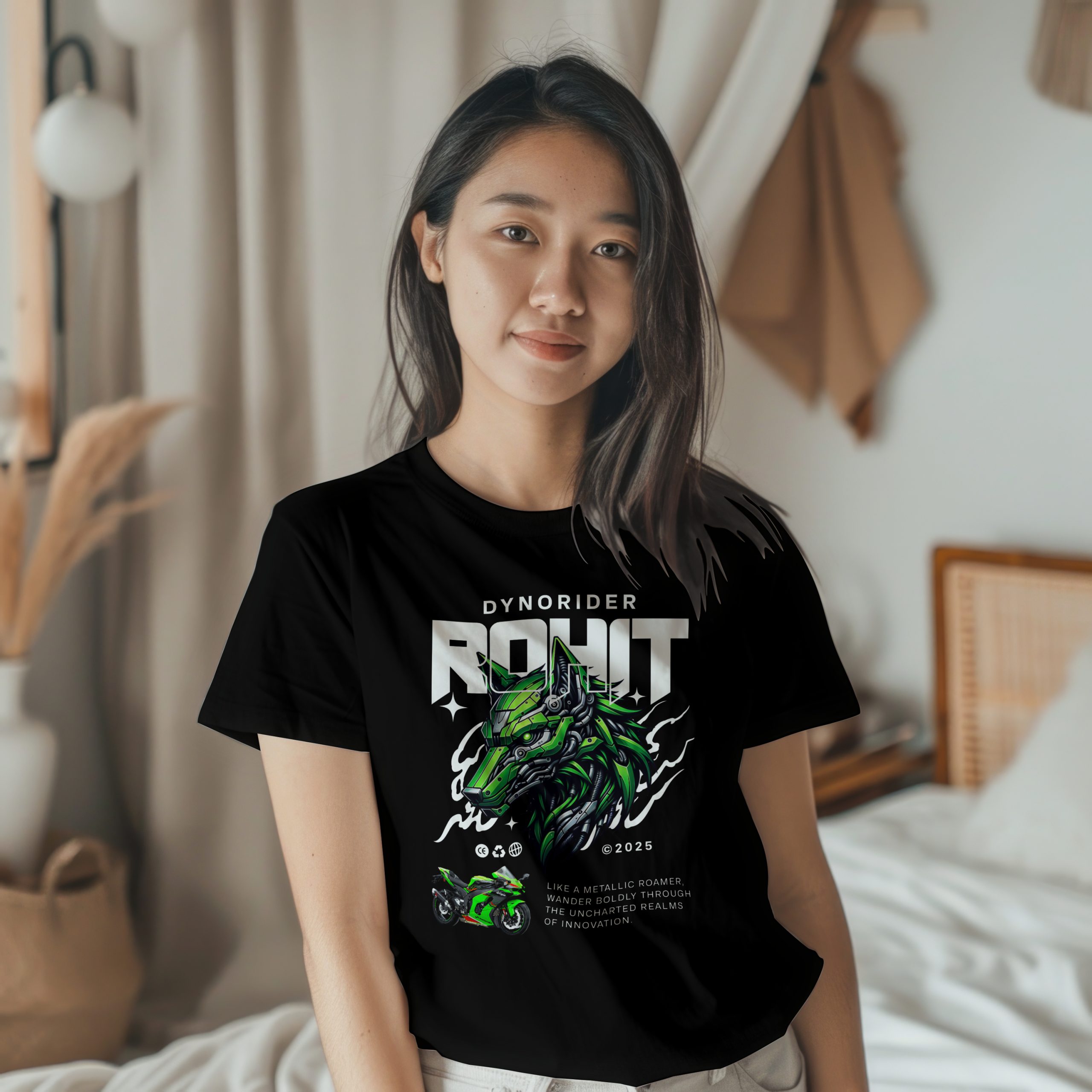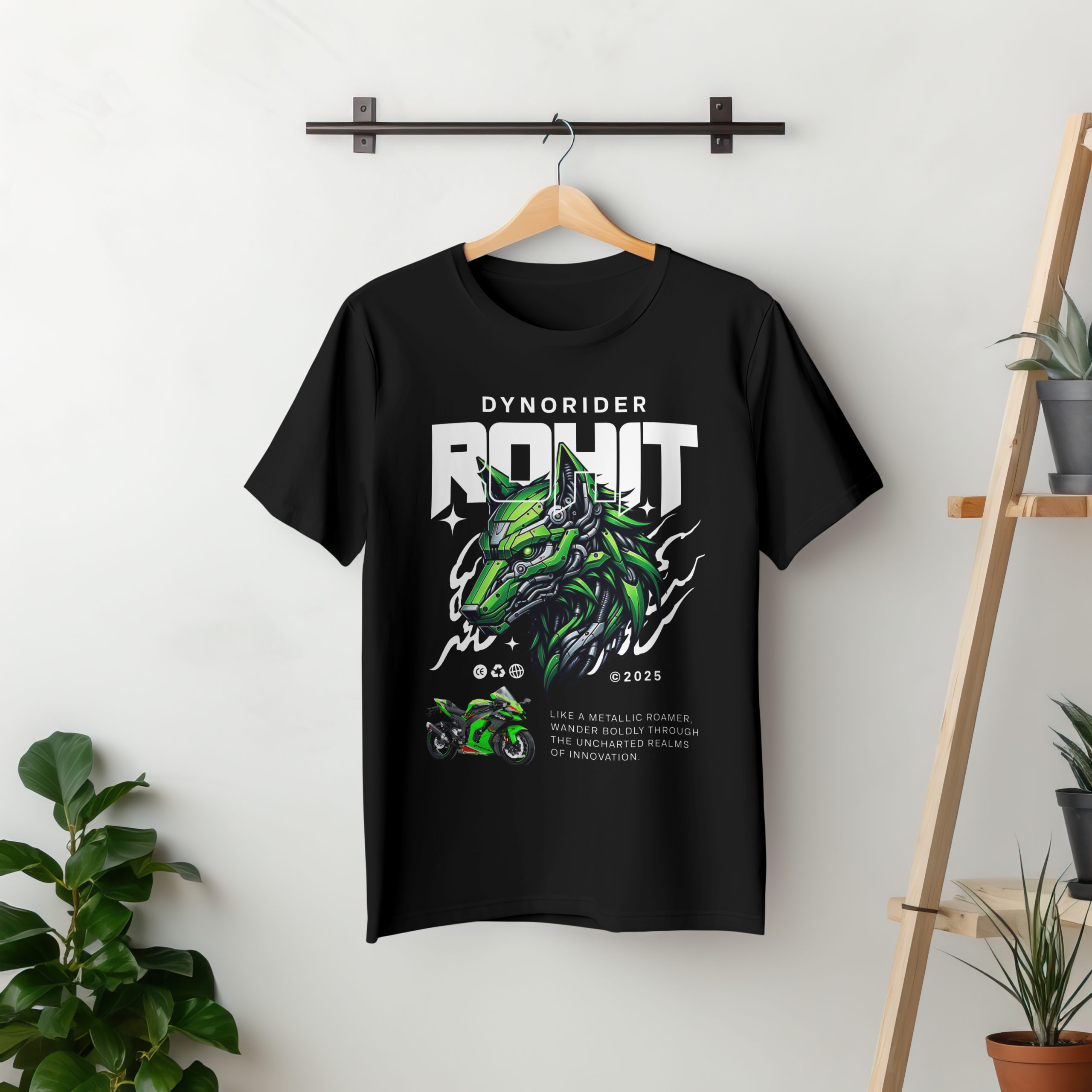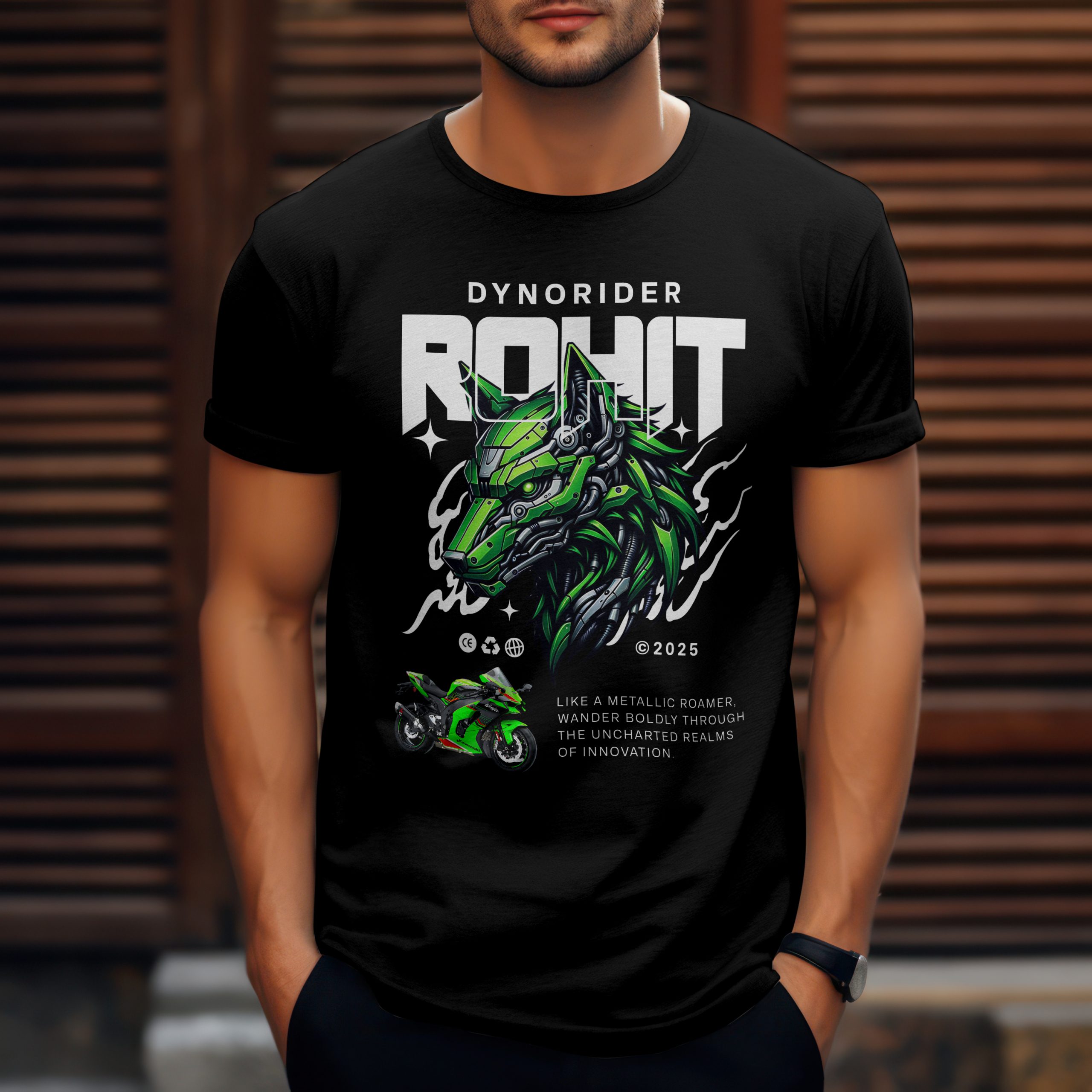 The design features a magnificent mecha wolf, its vibrant green and metallic hues mirroring the high-performance spirit of a Kawasaki Ninja. It’s a powerful visual representation of “a metallic roamer, wandering boldly through the uncharted realms of innovation.” Whether you’re a devoted follower of Dynorider Rohit’s adventures or simply someone who appreciates unique, bold art, this shirt is designed to turn heads.