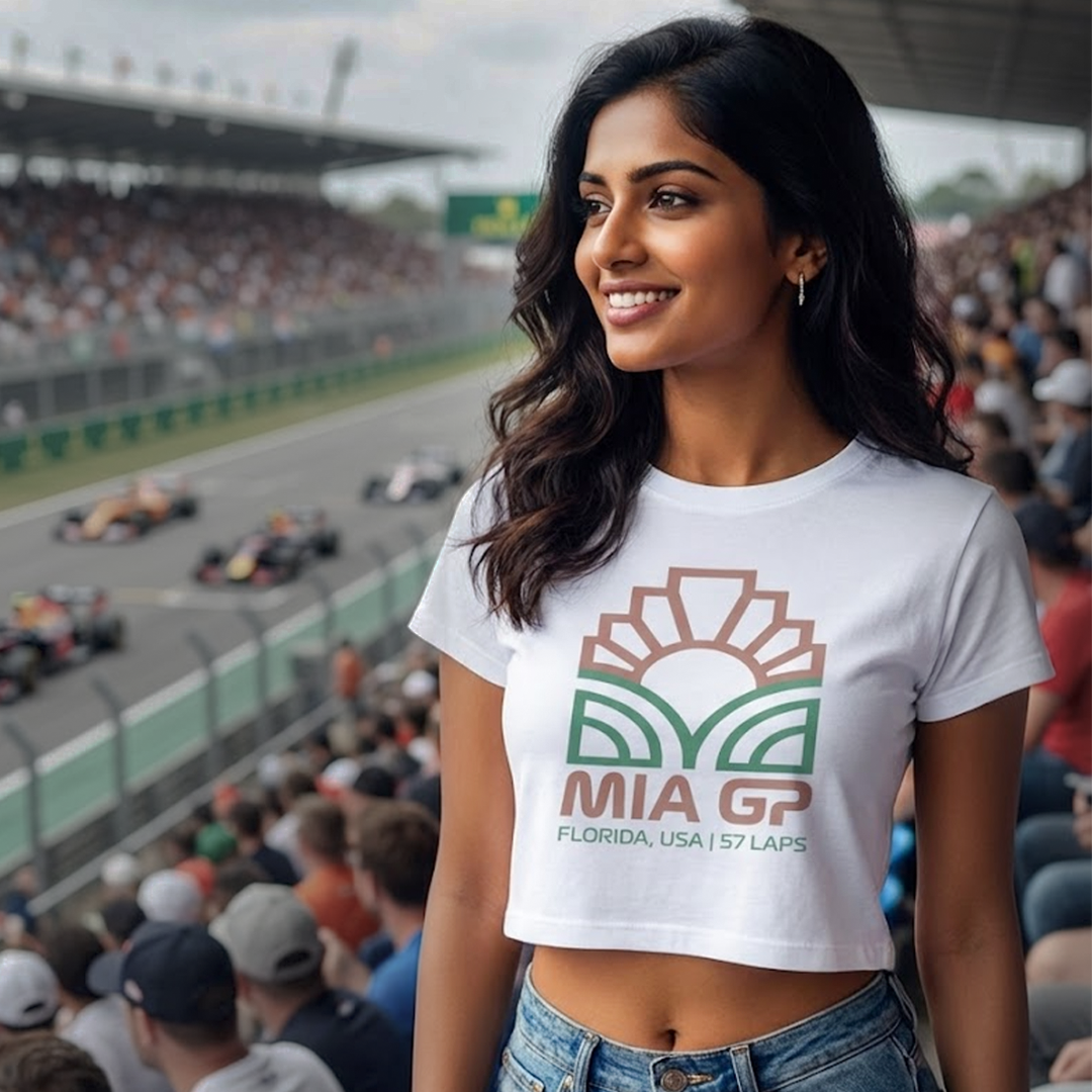 Bring the vibrant energy of the Miami International Autodrome to your wardrobe. This premium crop top features a custom Art Deco sunburst design, paying homage to the iconic 57-lap sprint around the Hard Rock Stadium.